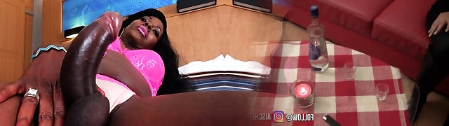 黑人妖展示了她的性感的身体然后玩弄她的硬的阴茎直到她达到高潮