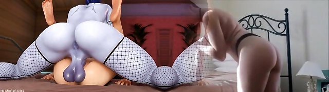 Ultra-cute animated blonde is closely watching the hot sex of huge-titted futanari.
