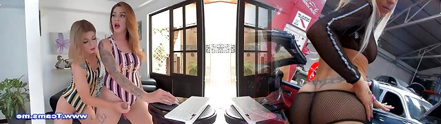 Giugno Thomas Giovane Trans Calze a Rete Accarezzando il Grande Tranny Cazzo TS