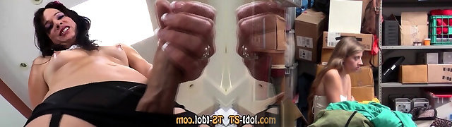 Ts在华丽的内衣wanks她的啄木鸟,直到她吹一个负载